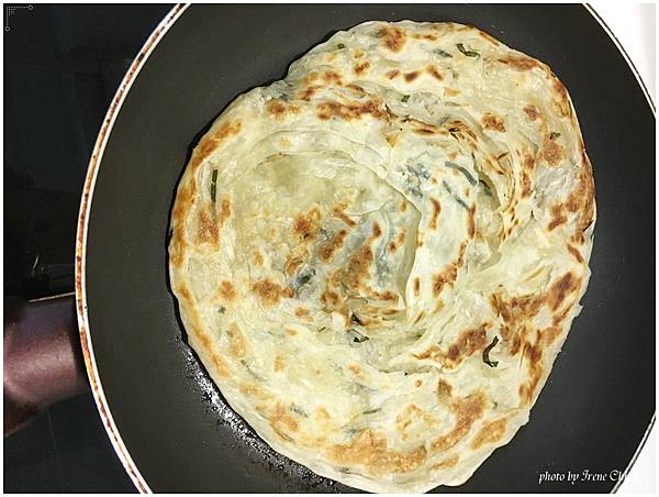 喜歡膨鬆空氣的就用筷子或夾子把餅從外圍向中央擠壓或夾一夾~就會變成口感層次多變的空氣感抓餅