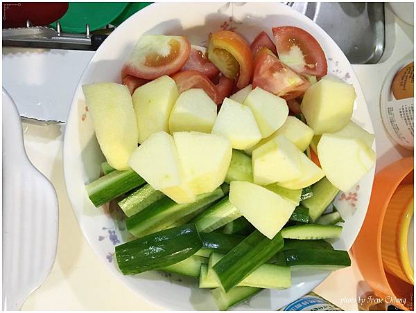 我看冰箱有什麼就切什麼~有小黃瓜、蕃茄、蘋果(覺得有蘋果大勝~超受小朋友歡迎)