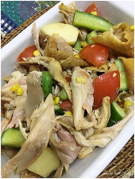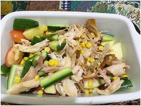 直接把剛剛撕好的雞絲肉和切好的蔬果加在一起,淋點雞油拌一拌就是一道好豪華的雞肉時蔬沙拉
