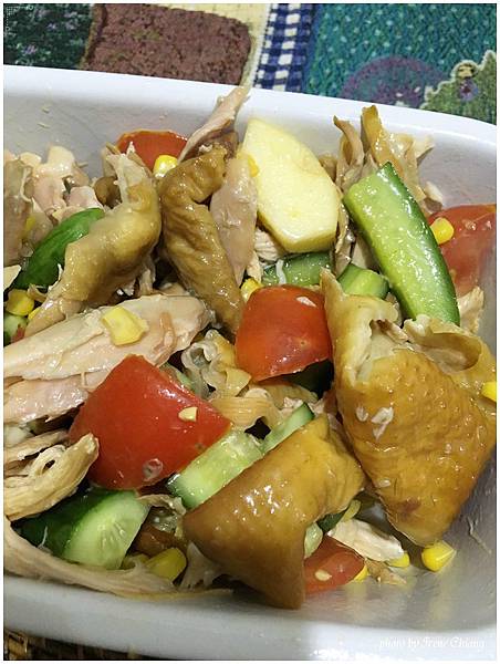 我自己吃了一口超驚豔的,因為雞肉的嫩和香加上爽脆的小黃瓜、微酸甜的蕃茄和重點是"蘋果"....甜甜爽口的蘋果